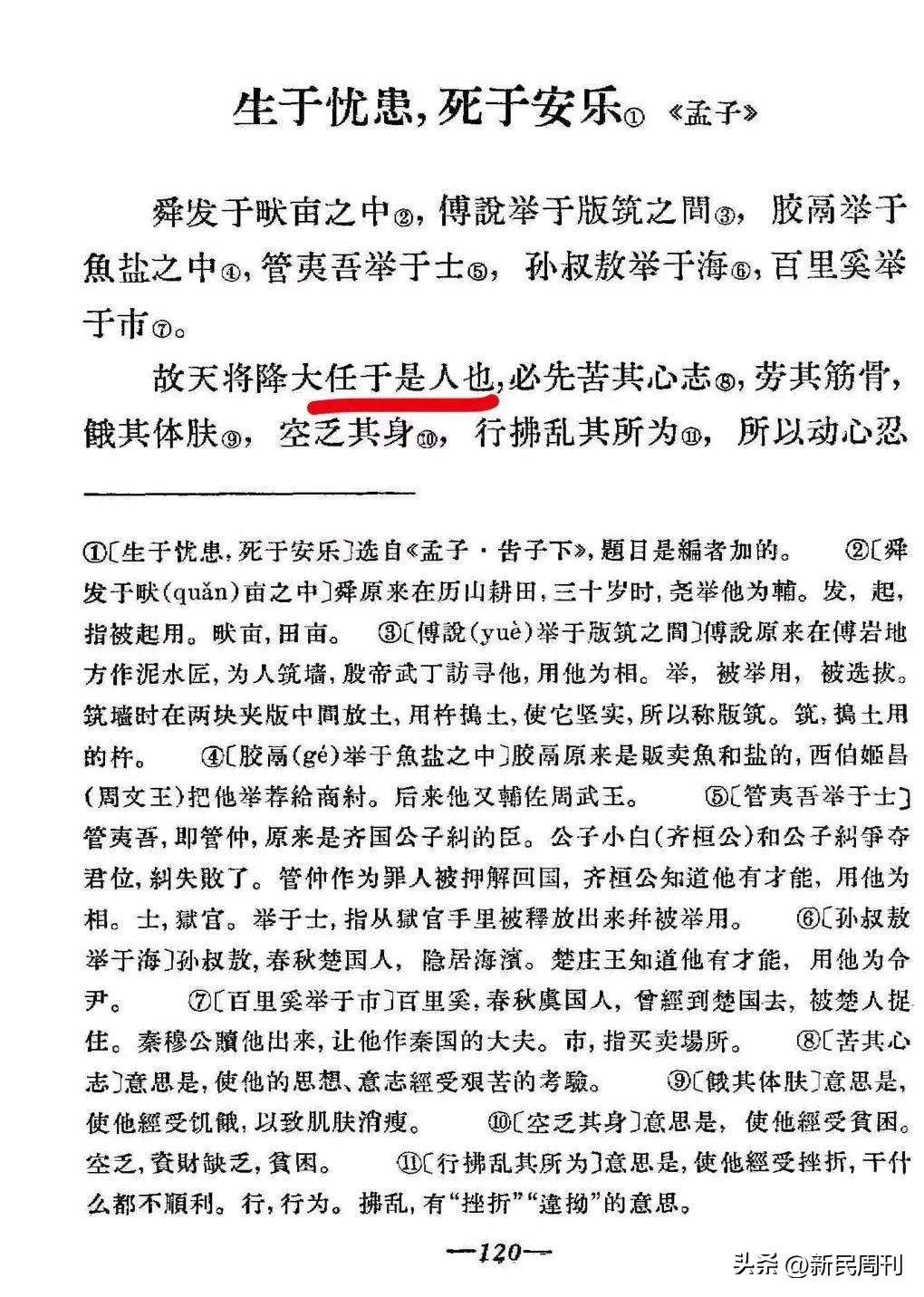 到了《孟子》的这段“生于忧患,死于安乐”,人民教育出版社从1961年收录孟子的《生于忧患,死于安乐》课文以来,历套教材文章一直是“故天将降大任于是人也”,从未有过“故天将降大任于斯人也”。