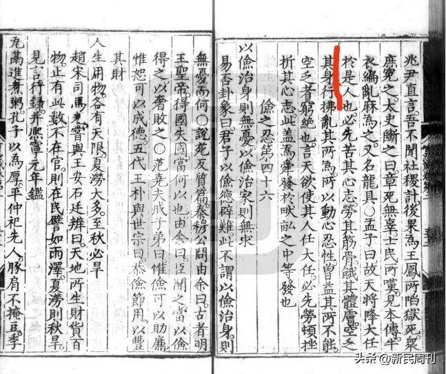 我在软件版四库全书中搜索这段原文,只查到“天将降大任于是人也”。昨天我在网上发现元代许名奎著的《劝忍百箴》写作“天将降大任于斯人也”,于是我去中国国家图书馆网站查询,查到明嘉靖十二年的《劝忍百箴考注》,写的还是“是人”。