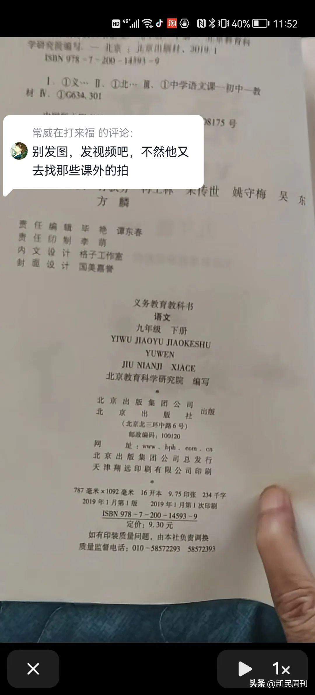 在我发稿之前,今天我看到网友“夜游神6446”在抖音上发出视频,2019年北京出版社出版的义务教育教科书九年级下册孟子《天将降大任于斯人也》一文,写作“斯人”。至少说明,教科书这段课文确实存在不同版本,恐怕不是网友集体记忆偏差即所谓“曼德拉效应”的结果,这是视频截图: