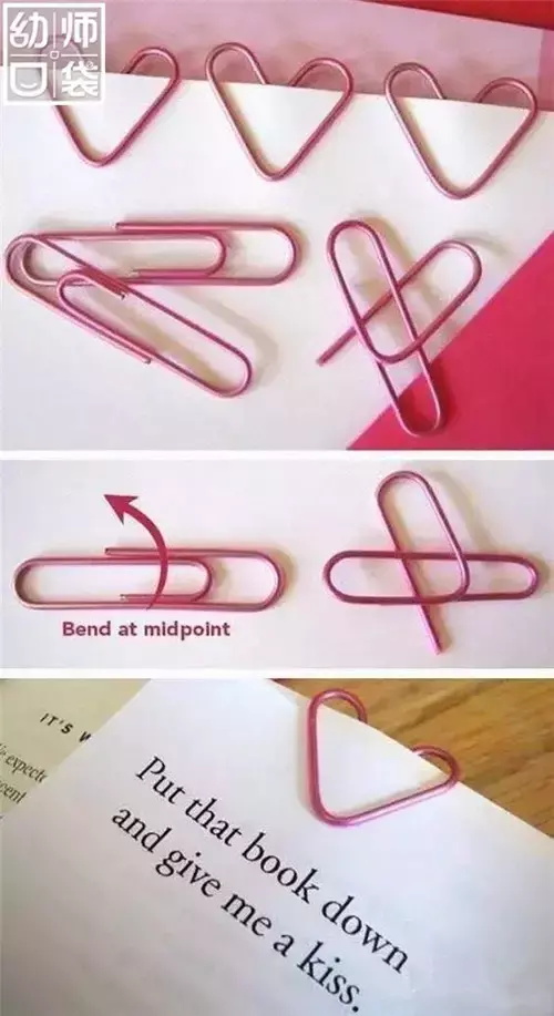 1b+老师说:回形针只要小小的改造,就能大变身。将回形针如图示方向弯曲,就成了一枚爱心书签,你想到了吗?