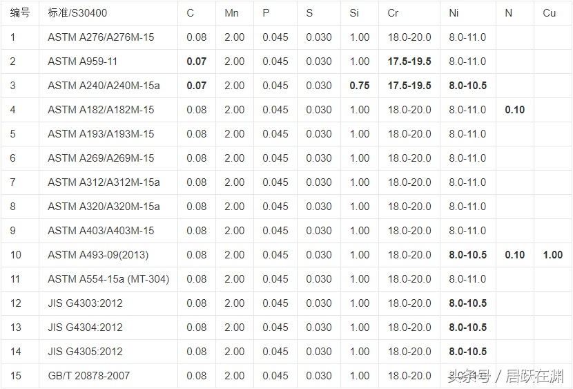 比如我们最熟悉的,304不锈钢(又叫奥氏体钢),就是在含碳量为0.08%(本段所提到的具体数据见下表)的钢中加入镍、铬等金属,是这种产品具有不生锈、可盛装食物等能力。一般我们认为,只要钢中的镍含量达到8%以上,铬含量达到18以上,便可称之为304不锈钢。但同为304不锈钢,也有好有坏。下图为304不锈钢在各种标准中的元素含量▼