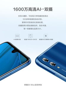 Honor 8X的拍照功能也非常出色。它配备了2000万像素+200万像素的后置双摄像头和1600万像素的前置摄像头,能够拍摄出令人惊艳的照片和视频。此外,Honor 8X还内置了多种拍摄模式和滤镜,让用户能够轻松拍出个性化的作品。