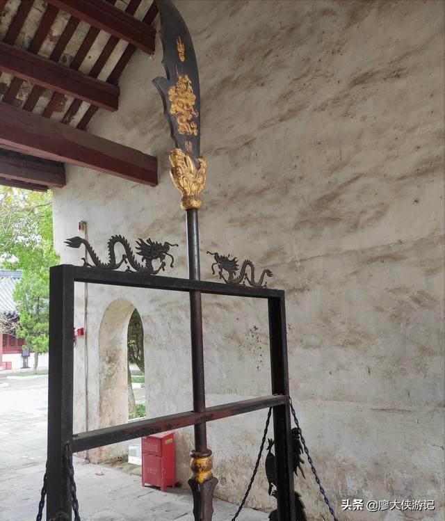 进入红门,前边便是一座称为“马殿”的建筑。建筑前的木柱上有一副对联,写着“马骑赤兔走千里,刀偃青龙出五关”,这两样可以说是关羽的标志性东西了。