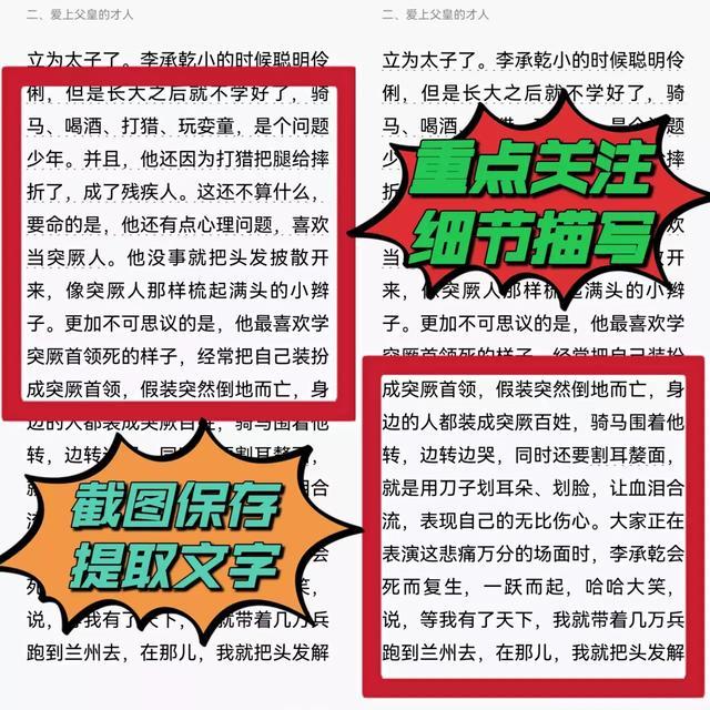 “抄书”其实一点不难,重点是你会不会抄。接下来我就给大家分享一下,我是怎么“抄书”的:首先要搞明白一件事,抄书是为了什么?我的目标非常明确——为了赚钱。赚钱的事,就要符合以下规律:第一、省时时间就是金钱。能省一点是一点。我下载了v信读书软件,下载别的读书软件也一样。然后就在里边选书。我的经验是人物传记最好抄,因为故事多,什么人物都可以,古今中外哪个界的都可以抄。我只要看到有用的内容就截屏保存,然后利用手机自带或者v信的“图片转文字”功能,再把文字复 制粘贴到记事本或文档上。