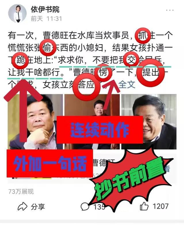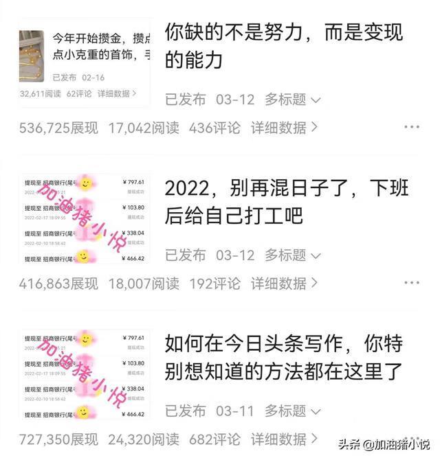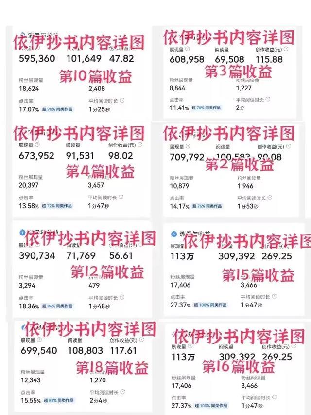 因为抄书抄上了瘾,我用四个账号,每天发10篇以上。一个月下来,轻轻松松20000元以上。我还总结了3点经验,这里也无偿分享给大家:第一点:开头必须吸睛。我的抄书稿,发的都是微头条。因为第一节省时间,第二要求不高。微头条的开头就相当于文章的标题,必须能达到抓人眼球的效果,否则很难爆。开头的写法有两种:一种是细节提炼法,就是把书中讲的故事中的某个细节放在开头写,以此达到让读者聚焦的目的。另一种叫故事梗概冲突法,就是把故事的情节概括出来,再从中提炼出冲突放在开头,以此制造悬念,抓人眼球。
