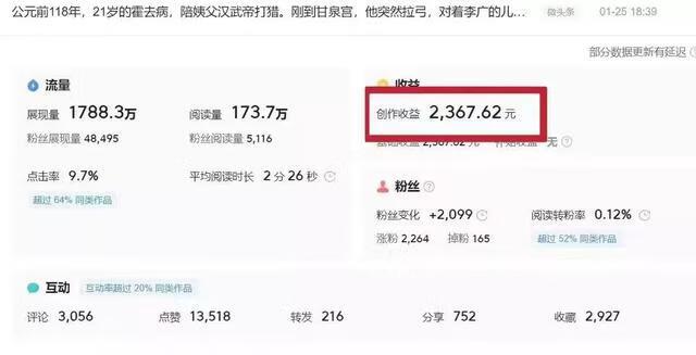 有时候突然哪篇来了灵感,出个大爆款,一篇就能赚出来一周的钱。比如我写清末首富盛宣怀那一篇,就有1000多万的展现量,收入了1437元。你说抄书这事香不香。