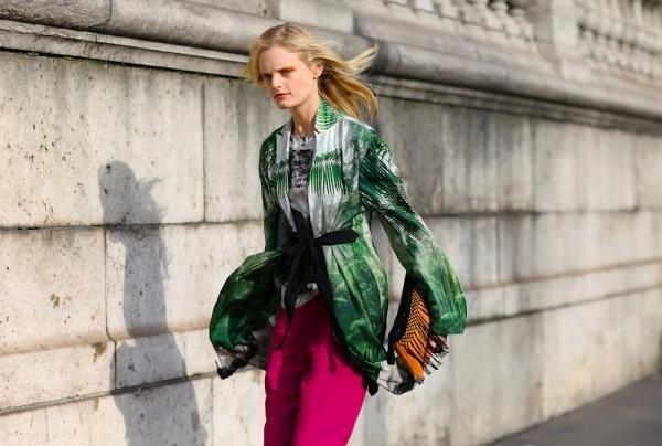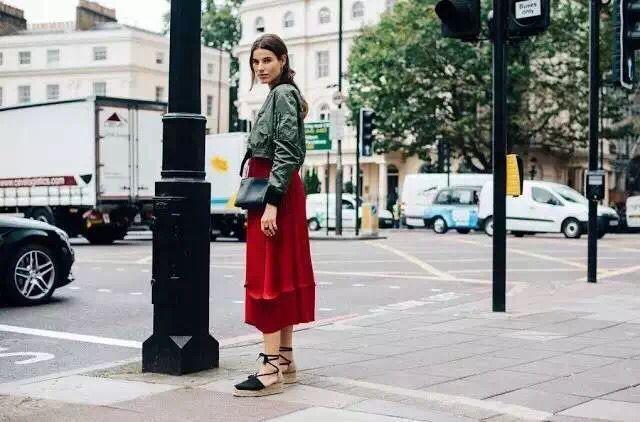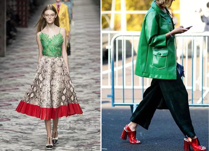 如果你对亮绿配大红有着迷之喜爱,那就可以参照配色的“二八法则”。不管是八分亮绿做底,红色的鞋包点缀,还是大红为底色,两分绿色点缀,都抢眼又好看。