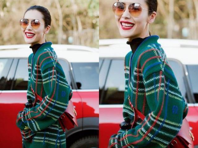 如果不想大面积穿红色和绿色,也可学习刘雯,把红色作为绿色的点缀,黑色的针织打底和撞色的针织衫搭配,为了让整体造型显得更加的协调所以刘雯选择了一条黑色的休闲裤、白色的鞋子,所以整体的造型看起来就主次分明,不过整体的造型最大的亮点还是在红色的包包搭配上,红色和墨绿色撞色很吸引眼球。