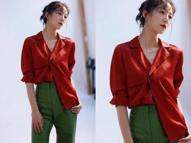 韩雪的一组秋季写真中,身穿红色条纹衬衫和绿色的裤子,这两个颜色可以说是相当冲撞了。韩雪却展现了自己的大气优雅的气质。红配绿穿在韩雪身上,满分!