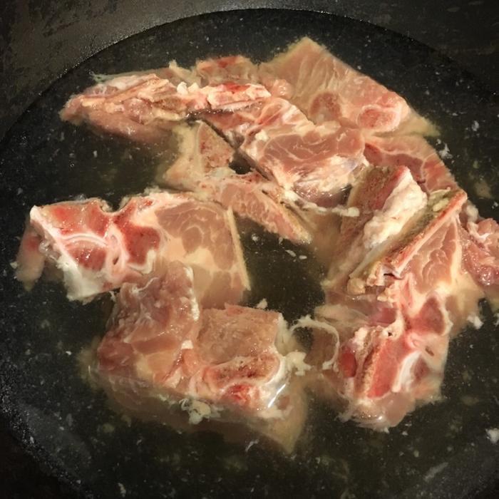 步骤1、首先将购买的一斤脊骨用冷水反复清洗干净。随后起锅烧水,脊骨冷水放入后开火,煮到沸腾后,将浮沫撇出去,随后将脊骨捞出洗净,随后控水备用。