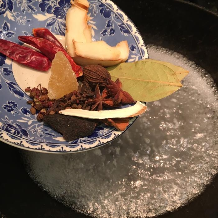 【烹饪食材】:猪脊骨一斤、生姜三块、桂皮一块、香叶两片、花椒粒一把、草果一个、陈皮一块、八角一个、白芷一块、干辣椒三个、冰糖少许、花雕酒30毫升、红烧酱油一勺、老抽半勺、黄豆酱一勺。