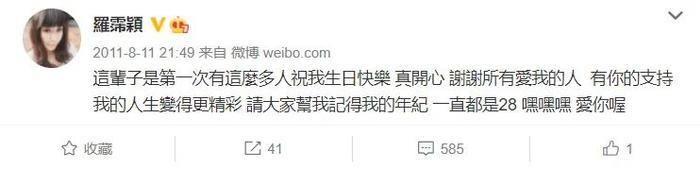 11年时的生日,她在微博感慨这辈子从未收到这么多祝福。