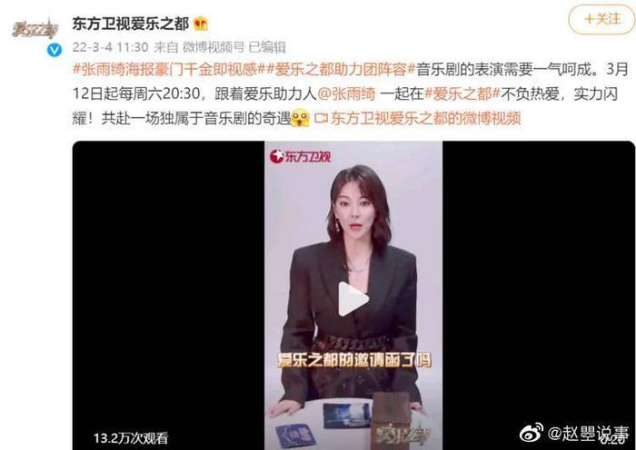 3月4日,东方卫视《爱乐之都》官宣张雨绮跨界加盟音乐剧竞演综艺《爱乐之都》,新节目将集结32位音乐剧演员,为观众带来前所未有的音乐剧盛宴。勇敢尝试不同领域,举手投足间很贵的样子,网友:超级期待她当导师,不知道又能爆出什么金句。