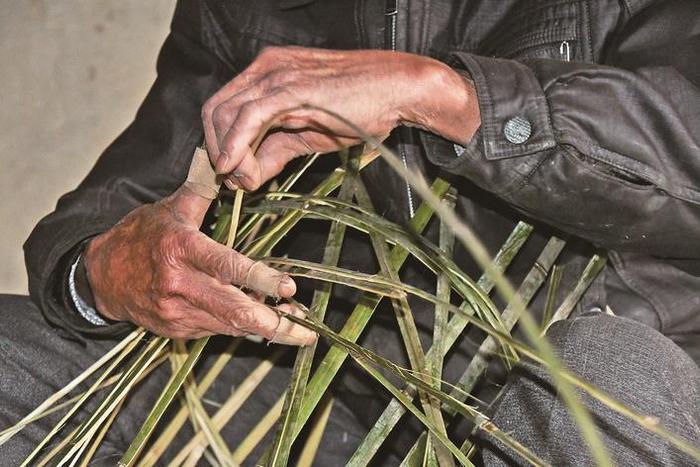 篾条就像毛线,5根篾条要编织成稻穗的图案,还要把14根篾条与笱篍的篾条缠绕在一起,一条接一条盘来绕去,纵横交错,让人眼花缭乱,老人编织起来却井然有序。一双布满沧桑的手,在青翠的竹条里盘绕,四千多年前的捕鱼神器渐渐成形。