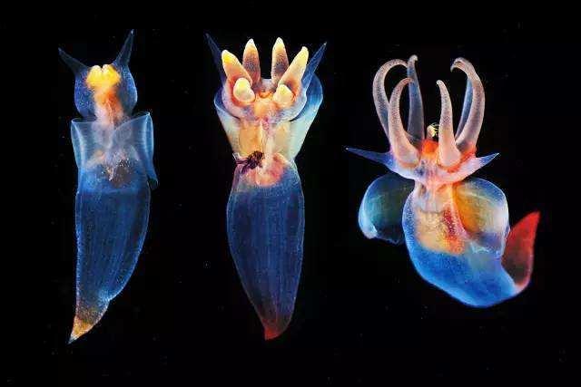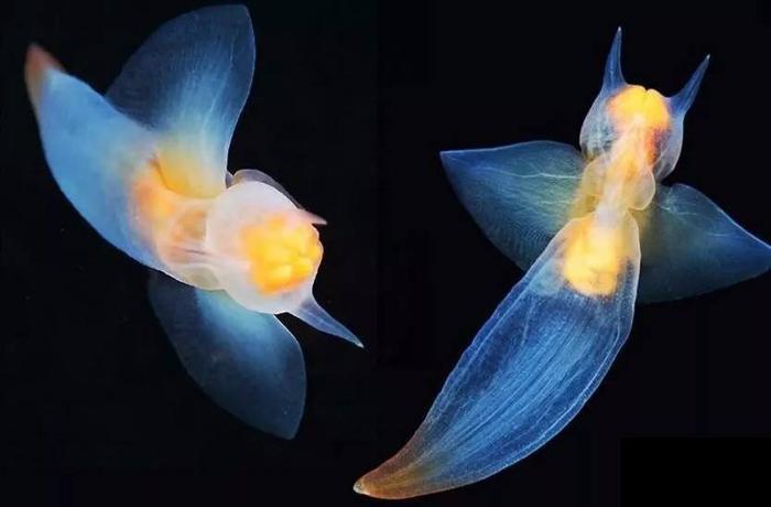 那这么小的动物平日里以什么为食呢?弱肉强食是动物界的天性,我们可千万不要被裸海蝶的外表所欺骗哦!它也是以比自己更小的动物—翼足螺为食的,俗称"海洋蜗牛"。翼足螺也是一种海生动物,但体长仅1cm,和裸海蝶基本在同一个环境中生存。另外裸海蝶还有一个重要的特征就是雌雄同体,同时拥有雄性和雌性的生殖器官。在进行交配时,两只裸海蝶会互相在对方体内替卵子受精,以此来繁衍下一代。