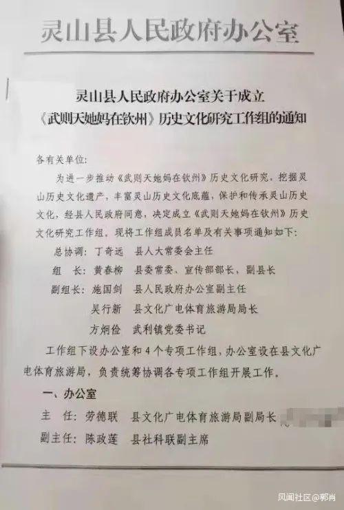 通知还公布了《武则天她妈在钦州》历史文化研究工作组成员名单,总协调为灵山县人大常委会主任丁奇远,组长则是县委常委、宣传部部长、副县长黄春柳。根据通知介绍,该工作组下设办公室和4个专项工作组,办公室设在县文化广电体育局,负责统筹协调各专项工作组开展工作。