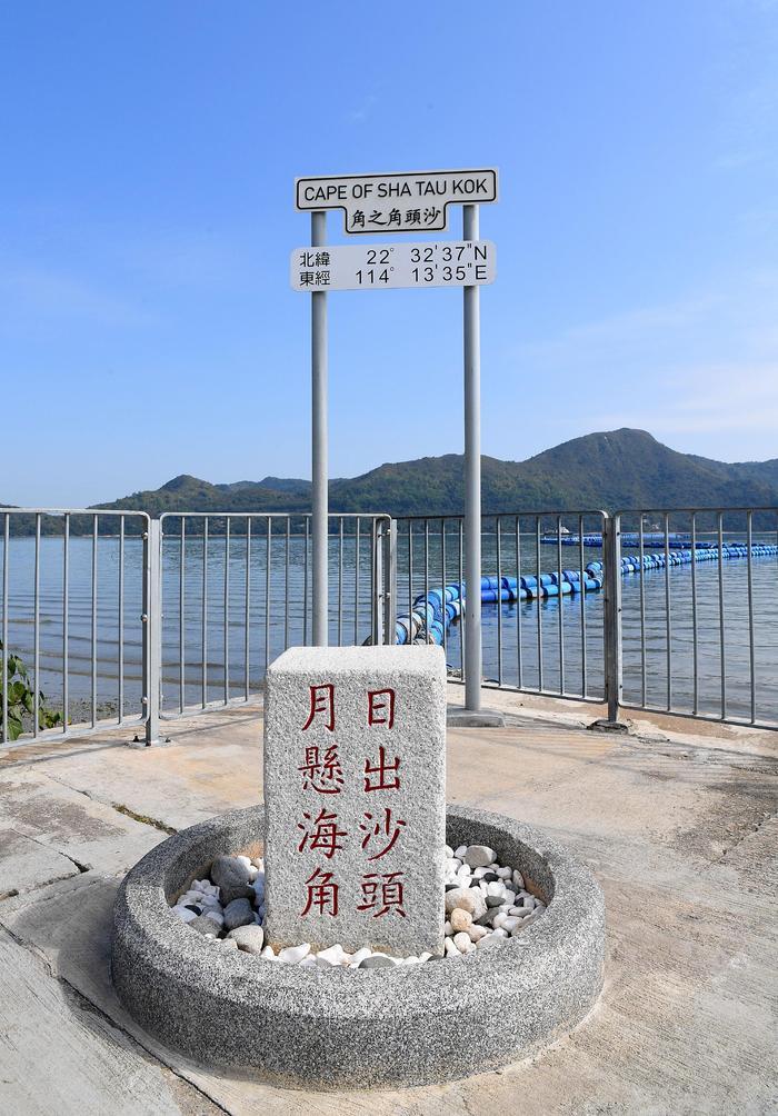 “日出沙头,月悬海角”,八个红色大字镌刻在仿制的界石上,格外醒目。相传这是清朝大臣巡视沙头角时所题的诗句,沙头角因此得名。