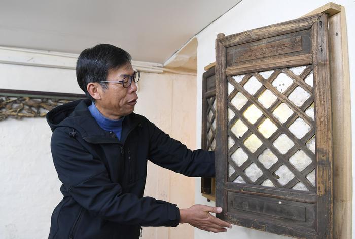 1月25日,“沙头角故事馆”创办人李以强展示他搜集到的老物件贝壳窗。新华社记者 陈铎 摄