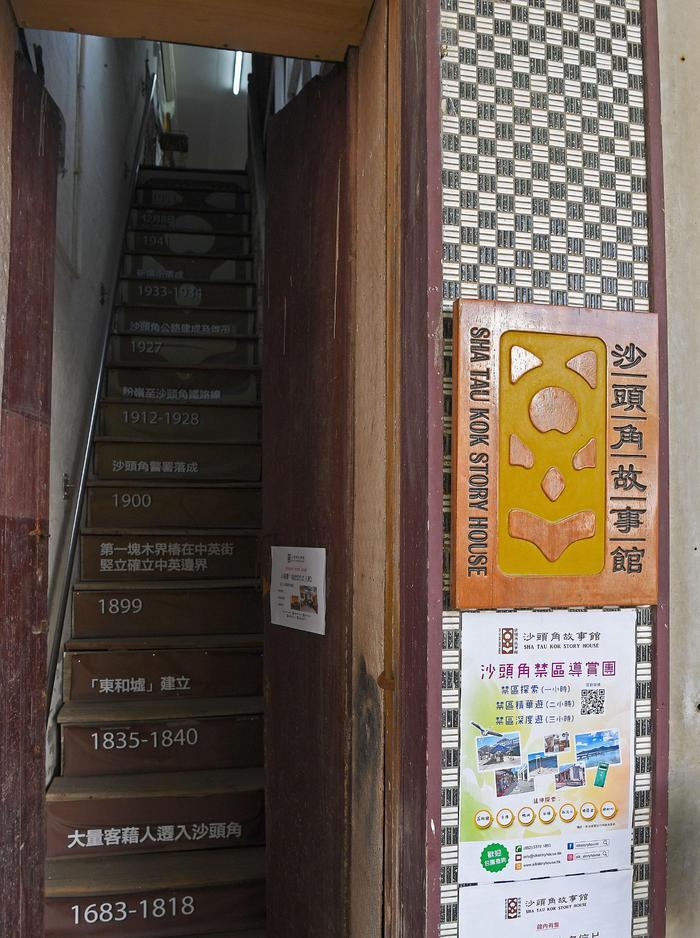 沿着故事馆狭窄的木楼梯上楼,每一个台阶都用白色的大字写上年份和大事记,第一个台阶上写的是“第一块木界桩在中英街竖立 确立中英边界”。