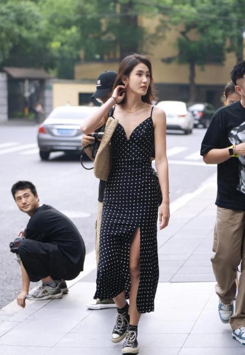 开叉的连衣裙就有点小心机在里面,因为是开叉,腿部有一侧露腿的部分,所以看起来更为高级时髦,在加上其他的一些配饰,增加了不少的细节看点,最为穿搭来说还是很高级的。