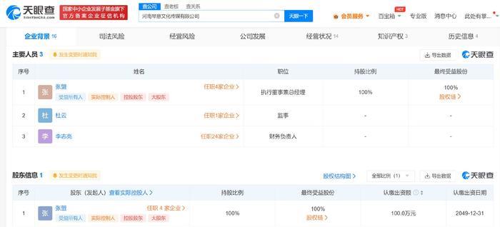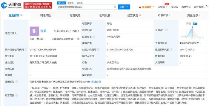 天眼查App显示,河南琴意文化传媒有限公司成立于2019年10月,法定代表人、执行董事兼总经理为张盟,注册资本100万人民币,经营范围含摄像及视频制作服务、组织文化艺术交流活动、动漫游戏开发、营业性演出等,由张盟全资持股。对外投资信息显示,该公司持有郑州青丘文化传媒有限公司30%股份。2022年年报显示,该公司参保人数为0。知识产权信息显示,该公司曾申请“鼓手吧”“打鼓吧”商标,其中“鼓手吧”商标已完成注册。