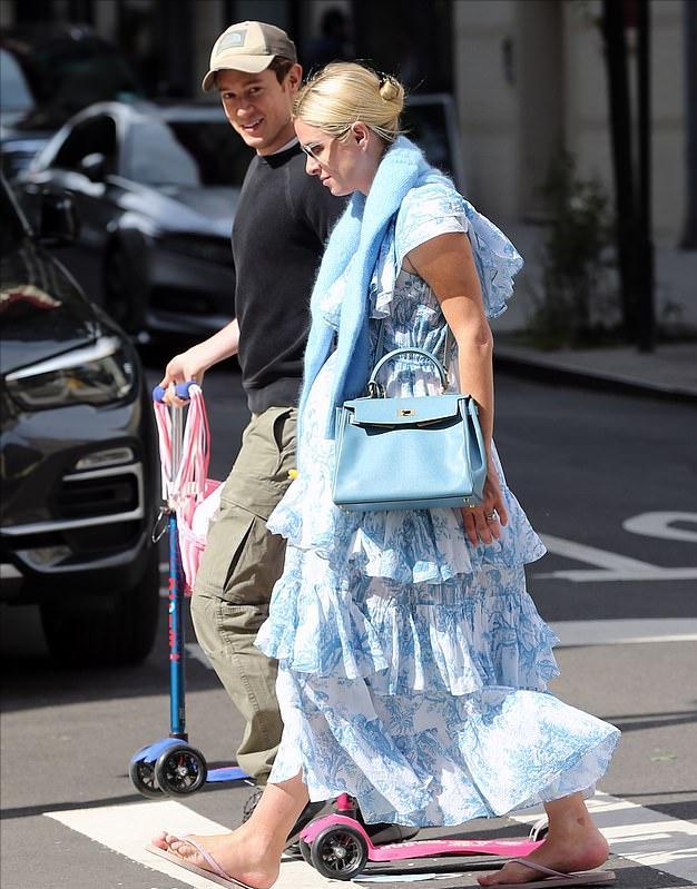 妮基推着女儿的小推车,粉粉的小推车一看就是女孩们喜欢的,竟然成了妮基的凹造型工具,妮基这身蓝色造型,从包包到披肩也都是蓝色系的,精致的孕妈啊!