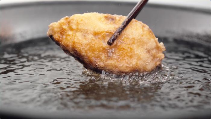 炸鮸鱼排——鮸鱼肉质的肥嫩,以秋季为最。在象山,人们将其花样入菜。裹面糊下滚油,炸至表皮金⻩。撒少许椒盐调味。焦脆的外壳下,⻥肉酥软温香。