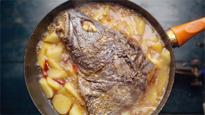 鮸鱼头烧土豆——⻥头与土豆同烧,随着鲜味物质浸透,胶质丰富的⻥皮出落得愈加不凡。⻥籽的饱满,⻥胶的绵糯,让滋味更上层楼。