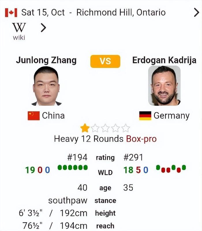 如今即将41周岁的张君龙再度出战,他的对手今年35岁,18胜5负12场KO对手,世界排名第291位,不出意外的话,张君龙打败对手没有问题。只是比赛的星级太低了,只有一颗星。距离五星级赛事,相差甚远。