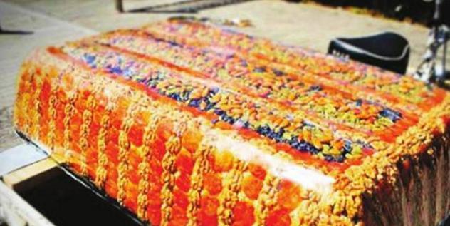 当然他们在制作的时候也注意到了它的外观,将所有的食材按照类别都排列得特别的有趣,而且排列的很均匀,看起来在制作的时候就特别的耗时耗力。一般他们选择的就是一些干果和水果,干了这些东西,其实价格都是很昂贵的,将其做成了这道地方特色之后价格自然也不便宜。而且新疆切糕的单价跟我们知道的不同,平常我们购买东西默认的单位是斤,但是切糕不一样,它默认的则是两。