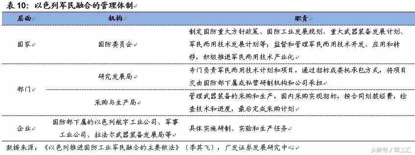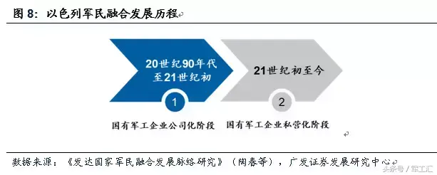 以色列:以武立国,高度重视国防工业,用军事技术带动国民经济发展。以色列建国之初即以国防工业为立国之本,优先发展国防高科技,以国防工业带动国民经济发展。以色列军民融合分为两个阶段,第一阶段是武器研发单位转为国有军工集团,并给予自主经营权,同时开始民品生产;第二阶段将军工企业进行私有化改革,鼓励并购重组,增强企业竞争力。