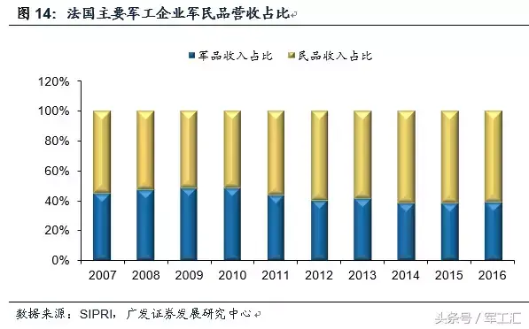 冷战时期,国防工业体系独立。冷战时期,军事对峙形势严峻,法国强调建立一个完全独立的国防工业体系,优先保证战略核武器的发展,法国军工企业绝大部分在国家的直接或间接控制之下,并主要依赖军品订货。因此,逐渐形成了能够研制生产包括核武器在内的各种武器装备的国防工业体系,军队装备国产率达95%。冷战结束前,法国国防工业近80%直接或间接为国家所有,核武器和大型常规武器及其重要的分系统全部由国家军工厂或国有公司控制,而且基本是独家垄断。