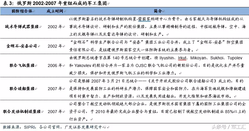 调整军工企业所有制,形成军工企业集团。俄政府采取保住重点、放开一片的方针,对军工企业所有制进行改造,旨在构建多种所有制并存的产权体系。据统计,俄罗斯共有2000多家军企,其中约820家完全私有化,560家保持完全国有化(包括航空、航天、核、部分机器制造重点军工企业)。