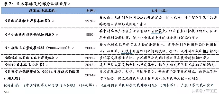 “寓军于民”战略以法律文件形式确定,拉开军民融合大幕。从60年代开始,日本政府提出军事技术的开发要充分利用民间的科研力量和开发能力,其“寓军于民”的军事工业指导思想逐渐明确。1970年,日本颁布《国防装备和生产基本政策》,提出最大限度利用民间企业的开发能力、技术能力,将“寓军于民”的战略思想以法律形式固定下来。自此,日本军民融合大幕正式开启。