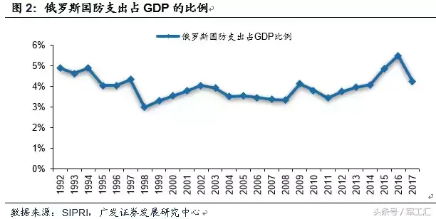 国防支出占GDP的比重由4.9%下降至3%。从1992年进入改革后,俄罗斯国防支出占GDP的比重呈阶段性下降趋势,国防支出由1992年占GDP的4.9%下滑至1998年的3%,国防工业对GDP的影响降至历史最低。这一比例的下降主要是由于国防工业产值的持续下滑,而不是军转民带动经济增长。