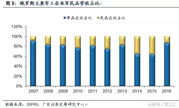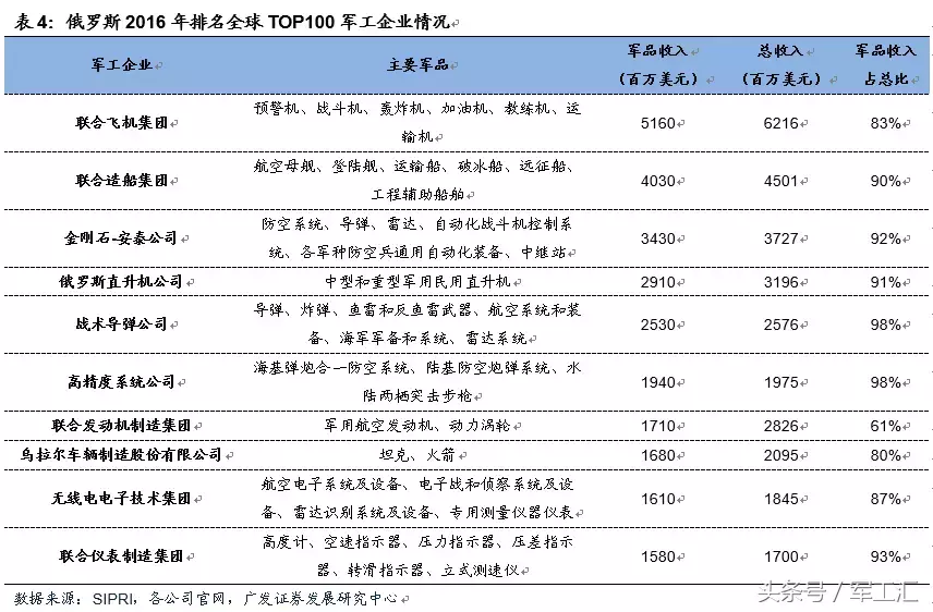 军工生产潜力仍未充分发挥,军转民尚处探索起步阶段。俄罗斯经过四阶段的军民融合之路,现已走在军转民的良性道路上。从90年代初2000多家军工企业缩减到现在1265家,军转民获得一定成效,但是大多数综合体的生产能力仍未充分发挥,军品、民品分割现象依然存在。据SIPRI机构2017年统计数据,2016年全球百强军企中俄罗斯占据10家,军品收入为266亿美元,占全球军工百强总销售额的7.1%。相比之下,民品收入占比较低,军转民仍需进一步推进。
