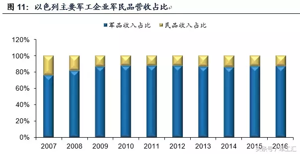 民用产业从军工技术发展中受益。以色列整体高新技术产业体系的形成,主要得益于军事高科技的转化推动。从民用技术来看,国内近400家高科技企业开发的大部分民用技术和产业,如电子设备、软件产业、生物技术和农业等,都是来源于军工企业的军事高科技。以色列工业公司成功转产程控电话,拉法尔开发医疗诊断设备,而埃尔比特公司的民品产值由之前的30%提升至70%。