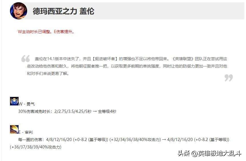 14.2版本盖伦W技能全等级CD变为4秒,提升了E技能前4级的攻击力加成。