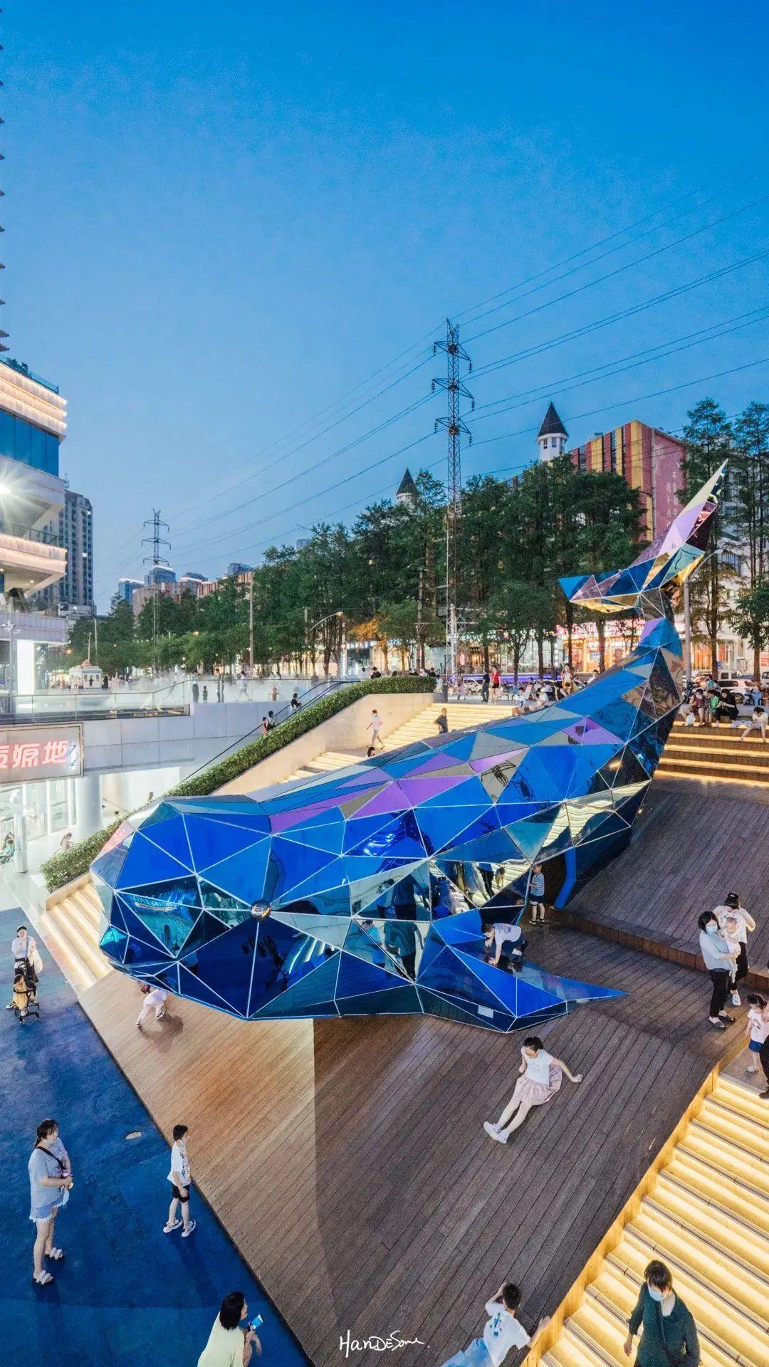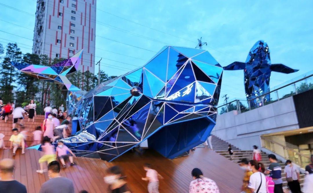 另一只则安静地躺在下沉广场的阶梯处,尾巴翘起、样子可爱。有意思的是,这只江豚本身还具有休憩和娱乐功能,它巨大的肚子里面是空的,成为巧妙的公共休闲空间,阶梯带来的自然坡度,也成为了孩子们滑滑板的乐园