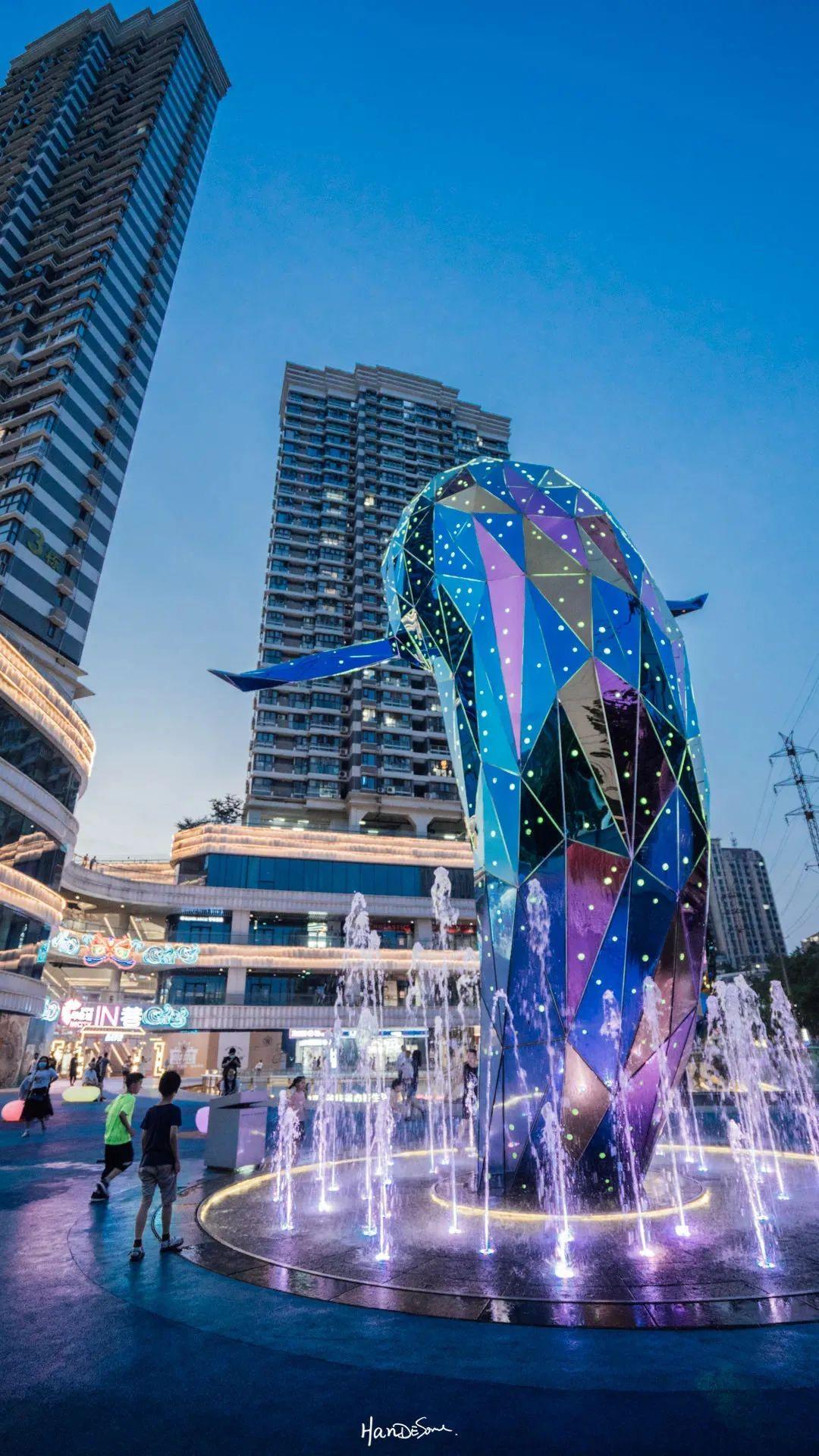 双子江豚的其中一只配合喷泉装置站在外广场的地面,向上高高跃起的姿态充满活力。到了夜晚,蓝色的江豚全身还会有节奏地产生灯光变化。