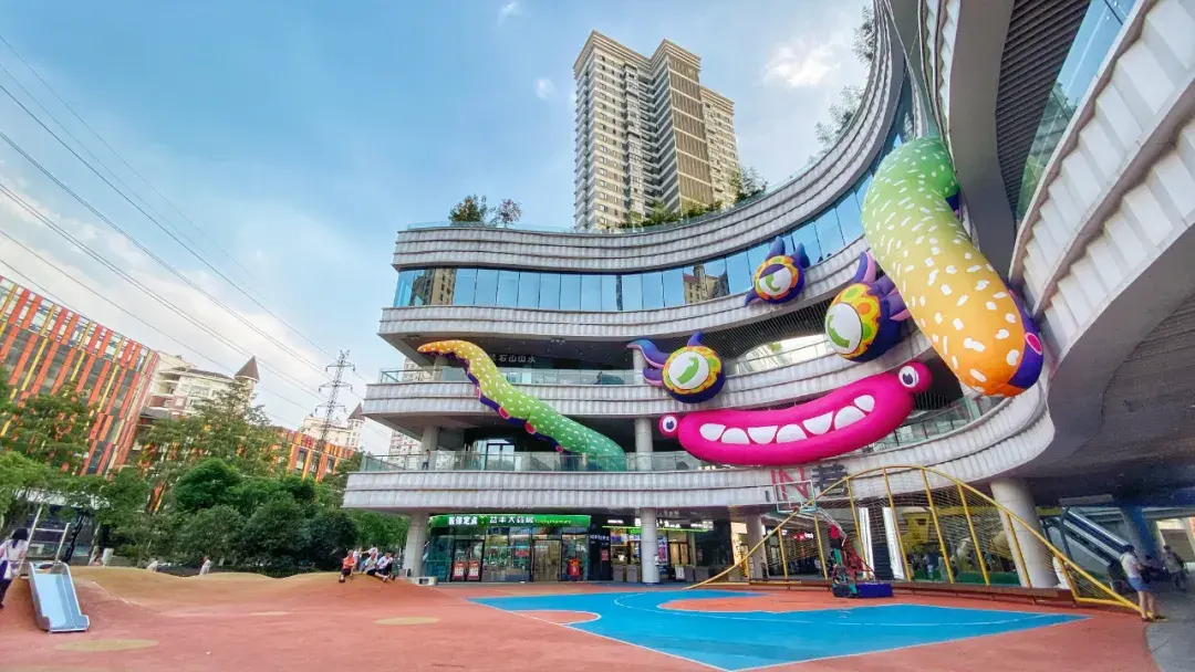 一方面,除了前文提及的外广场的大型儿童乐园之外,项目带来了年轻人喜欢的篮球公园,并在室内室外还各设有一面攀岩墙。