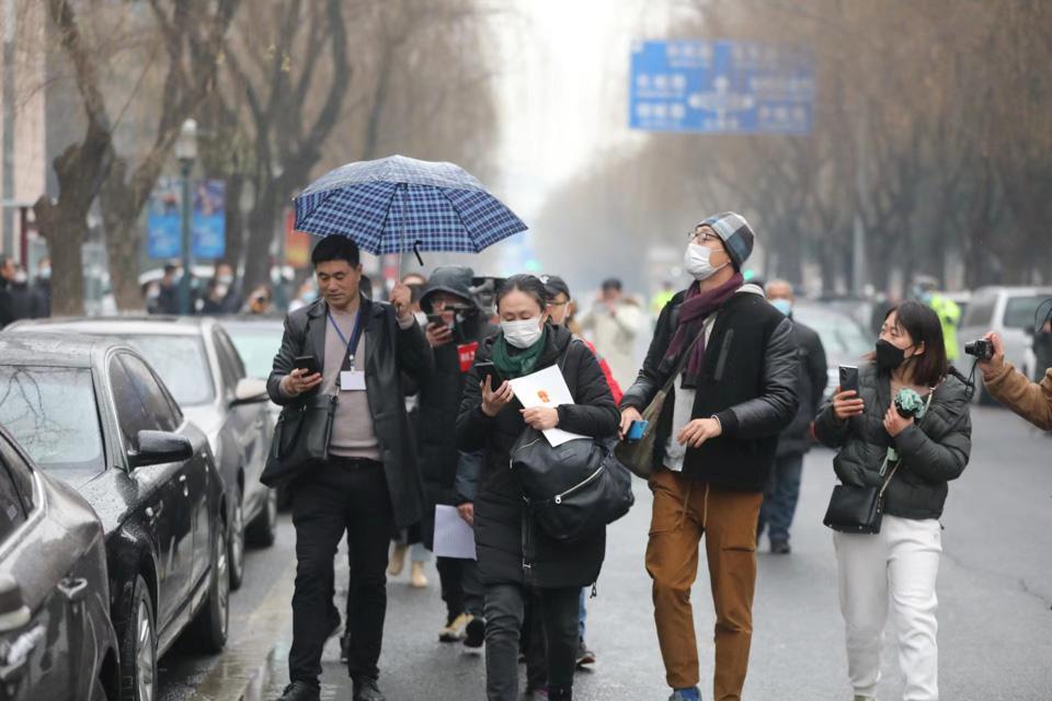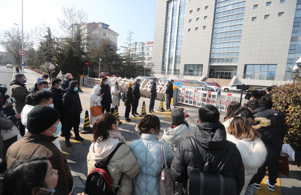 江歌母亲与刘鑫生命权纠纷案在青岛中院二审开庭,2022年2月16日下午2时许,法院门口围满了记者。 (视觉中国/图)