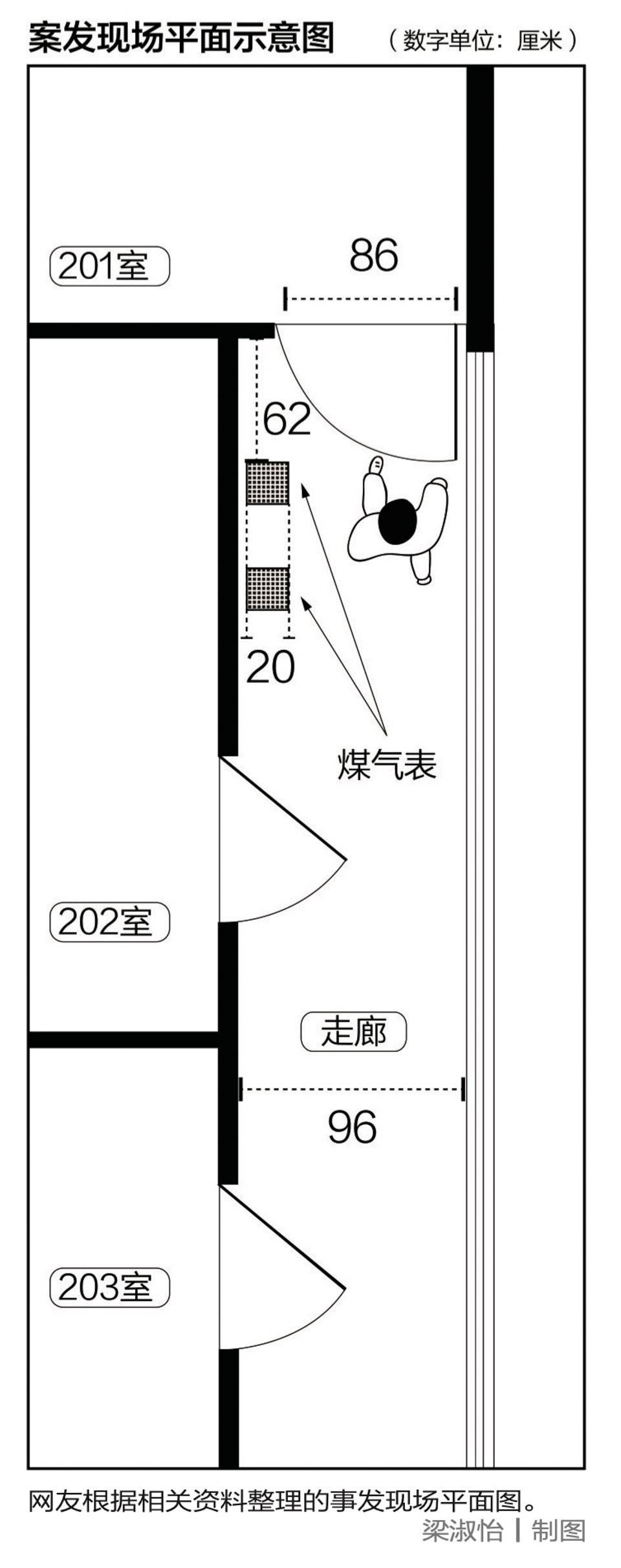在胡贵云看来,在刘鑫报警之前,江歌可能已经遇害。据警方现场勘查信息,大内公寓2楼的过道宽度仅96厘米,近端的煤气表距离门仅62厘米,煤气表本身探出墙壁约15厘米。胡贵云推测,江歌被陈世峰捅刺之后,倒下的身体正好卡在煤气表与门的狭窄空间,导致屋内的刘鑫无法推开门。二审庭审时,胡贵云用1:1的模型对此观点做了模拟演示。