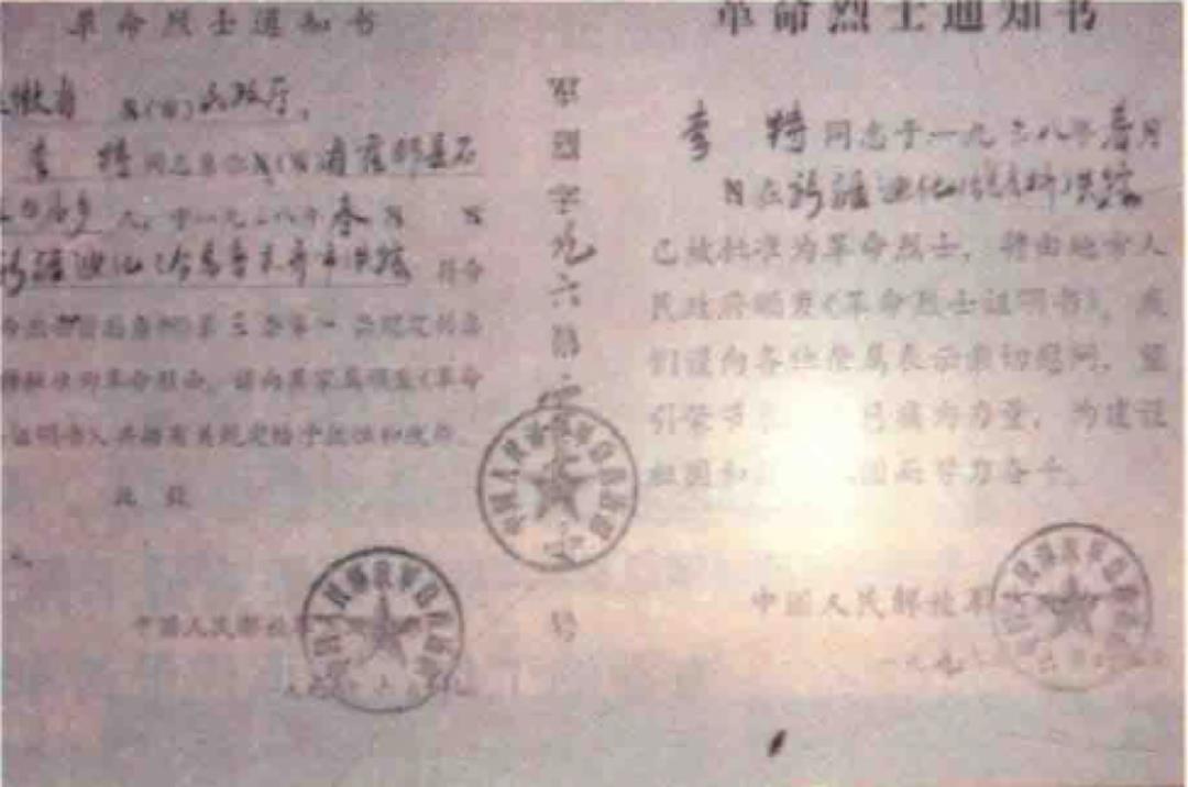 在中央军委总政治部颁发的烈士通知书上,清晰地记录着:“李特同志在长期艰苦卓绝的革命斗争中,为鄂豫皖、川陕革命根据地的创建与发展,为红军的建设与壮大,作出过贡献。参加长征、西路军,英勇作战,历经磨难,经受了严峻的考验。”