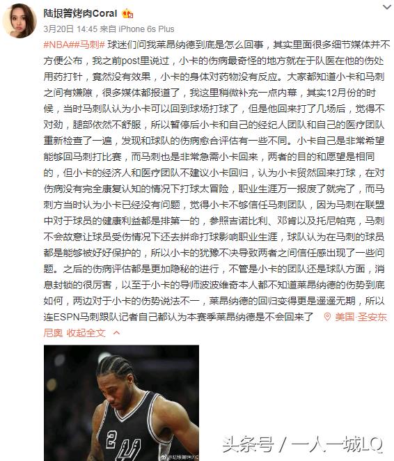 烤肉姐最后一条微博发布的时间是沃神爆料后的3小时内,所以里面的很多内容都是针对Woj报道的内容进行了她自己的说明,咱们就说一点,看马刺这些年球,他们的保密工作啥水平大家伙也都略知一二,在小卡康复消息严密封锁前提下,沃神爆料的可信度就要大打折扣了,开会应该是确有其事,但“激烈讨论”“恳求回归”等说法有可能就是记者二次加工后的杰作了。毕竟马刺是联盟中唯二能让沃神遭遇滑铁卢的对象(另外一个是老詹)。
