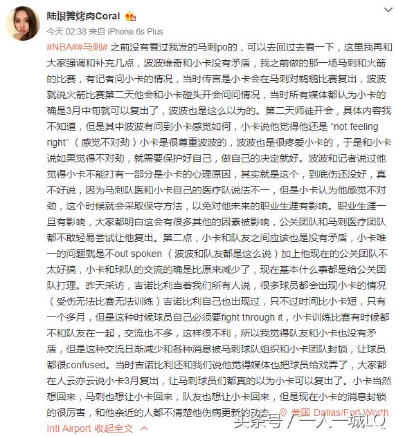 烤肉姐的微博多次提到小卡不善于和教练队友沟通,交流也越来越少,现在的消息都是交给公关团队打理,我想这也是这次球员内部会议召开的真正原因。大家都听到消息说3月份会等到小卡的复出,但却迟迟见不到上场迹象,所以干脆找到本人亲自核实。卡哇伊一直是个老实孩子,但你是马刺的当家球星,有什么想法和消息及时知会大家一声,当面摊开说要比猜来猜去要好的多,也更利于球队团结不是。