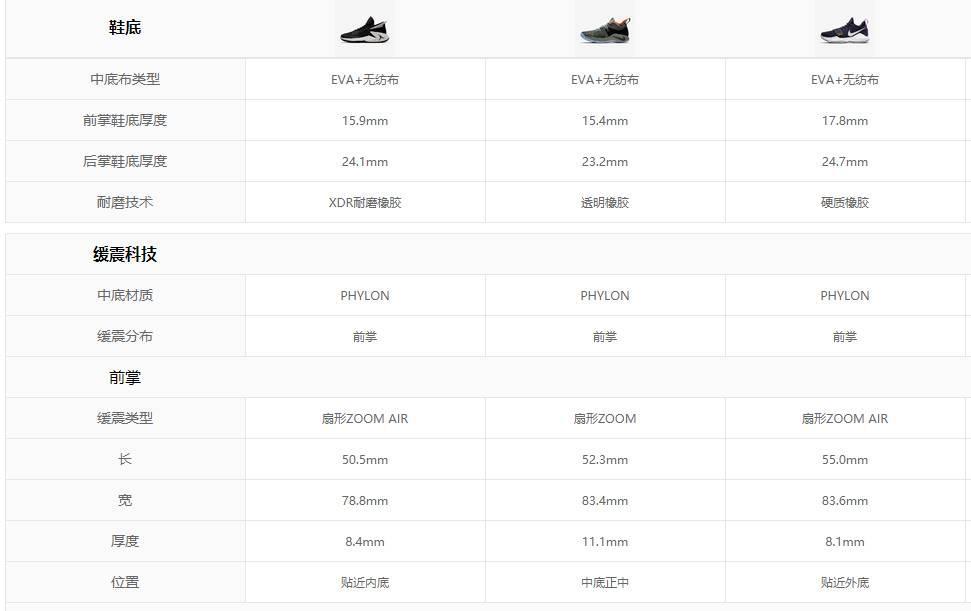 三款鞋均采用前掌ZOOM AIR气垫+足弓TPU支撑板的配置