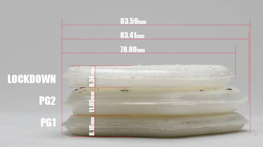 三款鞋中底配置俯视,足弓TPU支撑板中PG1个头最大,LOCKDOWN个头最小