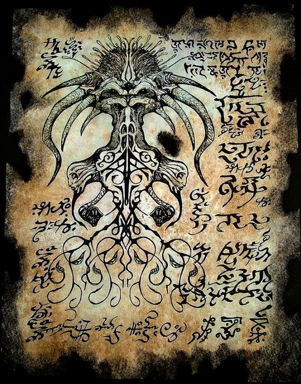撒但在这里建造了他的巴比伦庭院,在孩童纯洁无瑕的血液中,发着磷光的莉莉斯冲刷着她不洁的肢体。梦魇和魔魅咆哮着颂扬月阴女神赫卡忒,无头的怪胎在向地母神(the Magna Mater)哀诉。山羊跳向微弱的、受诅咒的笛声飘来的地方,潘神越过扭曲的似肿胀的癞蛤蟆般的岩石,无休止地追逐畸形的农牧神。摩洛神和恶魔亚斯她录(Ashtaroth)也在这种场合现身;因为在所有诅咒的典范中,意识的边界已经毁坏了,这个世界自然根本无法对抗从黑夜的井中汹涌袭来的东西......