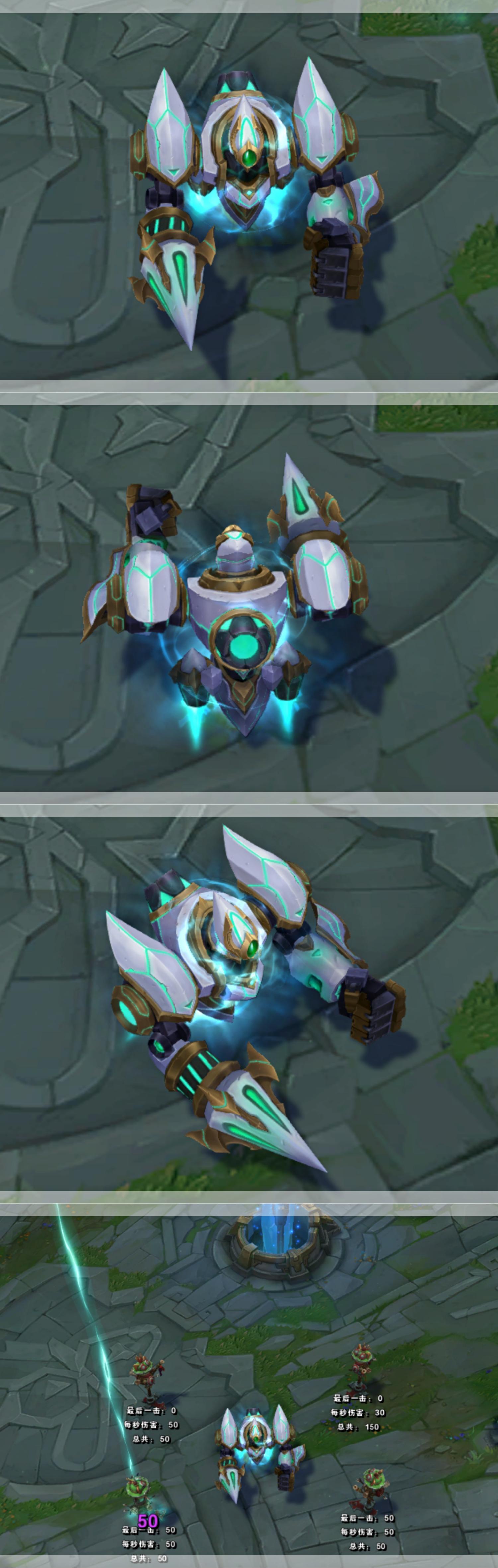 【R被动】:升级R技能后,身体就会被一层青绿色电光护体保护。而且身上的一些纹路或者说身上的缝隙(水口)更合适,这时也会点亮为青绿色。表现出能量过载的现象,这两种颜色的搭配非常简约且高级